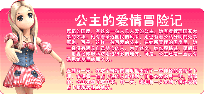 现在你已经来到了传说中不可思议的劲舞城,这里的每一位MM都有可能是那位美丽的公主,每时每刻都在跳舞,每时每刻都在寻找着那位曾被命运牵引着来到自己身边的精灵,等待重续一段绝世的情缘。一霎那间的目光凝注,也许就是缘定三生的深情契约。想知道公主的爱情命运如何?是否足够幸运能找到一见钟情的精灵?一场关于爱情的冒险能否走到终点?结局尽在你把握!