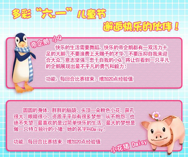 帝企鹅 小Q和小花猪 Daisy不仅能让你吸引眼球,更能在每回合比赛结束后,额外增加20点经验值,助你加速升级!